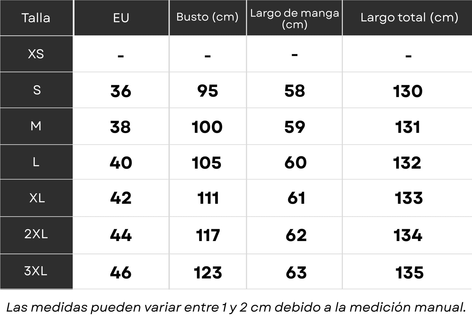 Puedes solicitar un cambio de talla gratis una vez.